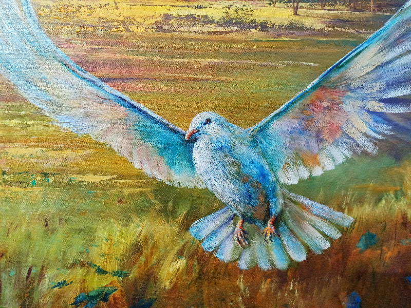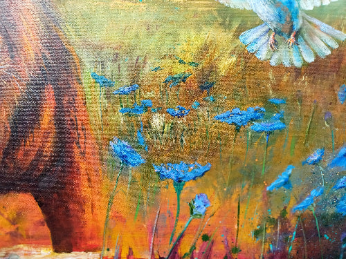 The magnificent lion arrives on crest of a ridge, moving forwards with the plains behind him and new beginnings ahead, with blue cornflowers around him, he enters new lush ground where a new dawn awaits.